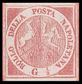 Following Sardinia, other Italian states also issued stamps. These include Tuscany (April 1851), the Papal States (January 1852), Modena (June 1852), Parma (June 1852), Kingdom of the Two Sicilies (Naples - January 1858; Sicily - January 1859), Romagna (September 1859) . In the Lombardo-Venetian kingdom under the Austrian Empire, stamps were also issued with denominations in the local currency.