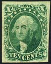 1857 saw the introduction of perforation, and in 1860 24¢, 30¢ and 90¢ values (with still more images of Washington and Franklin) were issued for the first time. These higher denominations, especially the 90c value, were available for such a short time (a little over a year) that they had virtually no chance of being used. The 90c stamp used is a very rare item, and so frequently forged that authorities counsel collectors to shun cancelled copies that lack expert certification.[20]