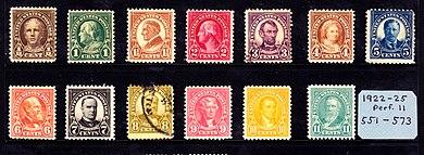 Stamp printing was switching from a flat plate press to a rotary press while these stamps were in use, and most come in two perforations as a result; 11 for flat plate, and 11x10.5 for rotary. In 1929, theft problems in the Midwest led to the Kansas-Nebraska overprints on the regular stamps. (See also: Fourth Bureau issue).
