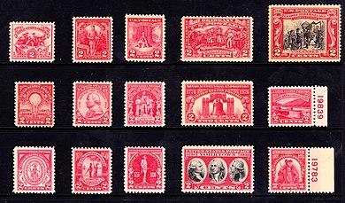 In these years, the postal service continued to produce commemorative sets in conjunction with important national expositions. The Louisiana Purchase Exposition in St. Louis, Missouri in 1904 prompted a set of five stamps,[33] while a trio of stamps commemorated the Jamestown Exposition, held in Norfolk, Virginia in 1907.[34]