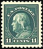 1908 saw the beginning of the long-running Washington-Franklin series of stamps. Although there were only two central images, a profile of Washington and one of Franklin, many subtle variants appeared over the years; for the Post Office experimented with half-a-dozen different perforation sizes, two kinds of watermarking, three printing methods, and large numbers of values, all adding to several hundred distinct types identified by collectors. Some are quite rare, but many are extremely common; this was the era of the postcard craze, and almost every antique shop in the U.S. will have some postcards with green 1¢ or red 2¢ stamps from this series. In 1910 the Post Office began phasing out the double-lined watermark, replacing it by the same U S P S logo in smaller single-line letters. Watermarks were discontinued entirely in 1916.
