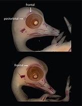 The postorbital is one of the bones in vertebrate skulls which forms a portion of the dermal skull roof and, sometimes, a ring about the orbit. Generally, it is located behind the postfrontal and posteriorly to the orbital fenestra. In some vertebrates, the postorbital is fused with the postfrontal to create a postorbitofrontal. Birds have a separate postorbital as an embryo, but the bone fuses with the frontal before it hatches.