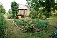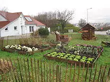 A vegetable garden (also known as a vegetable patch or vegetable plot) is a garden that exists to grow vegetables and other plants useful for human consumption,[5][6] in contrast to a flower garden that exists for aesthetic purposes. It is a small-scale form of vegetable growing. A vegetable garden typically includes a compost heap, and several plots or divided areas of land, intended to grow one or two types of plant in each plot. Plots may also be divided into rows with an assortment of vegetables grown in the different rows. It is usually located to the rear of a property in the back garden or back yard.[5] About a third of adults in the UK and America grow food in private or community kitchen or vegetable gardens.[7][8] In World War II, many people had a "victory garden" which provided food and thus freed resources for the war effort.[9]