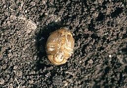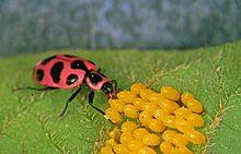 Colorado potato beetle females are very prolific and are capable of laying over 500 eggs in a 4- to 5-week period.[19] The eggs are yellow to orange, and are about 1 mm (0.039 in) long. They are usually deposited in batches of about 30 on the underside of host leaves. Development of all life stages depends on temperature. After 4–15 days, the eggs hatch into reddish-brown larvae with humped backs and two rows of dark brown spots on either side. They feed on the leaves of their host plants. Larvae progress through four distinct growth stages (instars). First instars measure about 1.50 mm (0.059 in) long, and the last (fourth) instars measure 8 mm (0.31 in) in length. The first through third instars each last about 2–3 days duration; the fourth lasts 4–7 days. Upon reaching full size, each fourth instar spends several days as a nonfeeding prepupa, which can be recognized by its inactivity and lighter coloration. The prepupae drop to the soil and burrow to a depth of several inches, then pupate.[4] In 5 to 10 days, the adult beetle emerges to feed and mate. This beetle can thus go from egg to adult in as little as 21 days.[19] Depending on temperature, light conditions, and host quality, the adults may enter diapause and delay emergence until spring. They then return to their host plants to mate and feed; overwintering adults may begin mating within 24 hours of spring emergence.[20] In some locations, three or more generations may occur each growing season.[4]