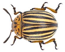 The Colorado potato beetle (Leptinotarsa decemlineata), also known as the Colorado beetle, the ten-striped spearman, the ten-lined potato beetle, or the potato bug, is a major pest of potato crops. It is about 10 mm (3&fras1;8 in) long, with a bright yellow/orange body and five bold brown stripes along the length of each of its elytra. Native to the Rocky Mountains,[3] it spread rapidly in potato crops across America and then Europe from 1859 onwards.