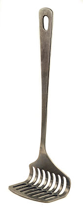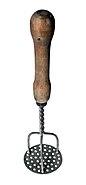 The potato masher consists of an upright or sideways handle connected to a mashing head.[4] The head is most often a large-gauge wire in a rounded zig-zag shape, or a plate with holes or slits. Basic designs made from a single piece of wood were used in Victorian times, before the more complex modern designs which are now used. This type of wooden masher, which is effectively a large wooden pestle, is still used in Scotland and is known as a 'Potato-Beetle' or just a 'Beetle'.[5][6]