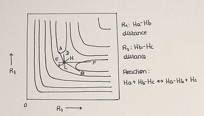 In contrast the PES for the reaction H + Cl2 → HCl + Cl is repulsive (or late-downhill) because R*HCl < R*ClCl and the transition state is reached when the products are separating.[8][9] For this reaction in which the atom A (here H) is lighter than B and C, the reaction energy is released primarily as translational kinetic energy of the products.[8] For a reaction such as F + H2 → HF + H in which atom A is heavier than B and C, there is mixed energy release, both vibrational and translational, even though the PES is repulsive.[8]