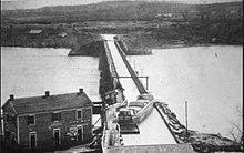 In 1830, merchants from Alexandria, Virginia, which was still part of the District of Columbia at the time, proposed linking their city to Georgetown to capitalize on the new Chesapeake and Ohio Canal.[1] Congress granted a charter to the Alexandria Canal Company in 1830,[2] and construction soon began on the Aqueduct Bridge that would carry canal boats across the Potomac River and downriver on the south side without unloading in Georgetown. The bridge was designed by Major William Turnbull.[3] Construction of the bridge and Alexandria Canal began in 1833, and both were completed in 1843.[3] To withstand Potomac ice floes, the piers were made of gneiss, with icebreakers made of granite.[4] The water-filled bridge was a weatherproofed-timber, queen-post truss construction.[5] The bridge was 110 feet (33.5 m) wide across the top. It had eight piers, each set on riverbottom bedrock and 7 feet (2.1 m) wide at the top. The third and sixth piers were 16 feet (4.9 m) wide at the top. Each pier was designed so that its top was 30 feet (9.1 m) above the mean high water level.[4] A narrow carriageway ran alongside the bridge. Later, a separate level for pedestrian and carriage traffic was added to the bridge. The tolls from the addition inhibited trade between Georgetown and Virginia, thus benefiting Alexandrian businessmen who retained Virginian trade.[6]
