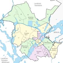 The city of Potsdam is divided into 34 Stadtteile (or quarters),[4] which are divided further into 84 statistical Bezirke.
