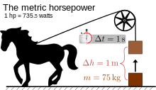 The dimension of power is energy divided by time. In the International System of Units (SI), the unit of power is the watt (W), which is equal to one joule per second. Other common and traditional measures are horsepower (hp), comparing to the power of a horse; one mechanical horsepower equals about 745.7 watts. Other units of power include ergs per second (erg/s), foot-pounds per minute, dBm, a logarithmic measure relative to a reference of 1 milliwatt, calories per hour, BTU per hour (BTU/h), and tons of refrigeration.