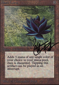 The "Black Lotus" card can be played at zero cost, and grants three mana (the game's primary resource) when sacrificed (discarded from play). Thus, the card gives the player an enormous jump in the early stages of a Magic game. Former Pro player and Magic writer Zvi Mowshowitz has declared Black Lotus as the best card of its type of all time, claiming every deck in the history of the game is better with a Black Lotus in it.[8][9] It has since been banned from all official tournament formats save for Vintage, but even there, it is limited to one copy per deck, compared to the normal allowance of four.[10] The illustration on Black Lotus was painted by Christopher Rush, who was at the time a Wizards of the Coast employee. The Black Lotus illustration is a depiction of a black lotus flower over a foliage backdrop.
