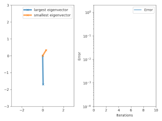 #!/usr/bin/env python3 import numpy as np def power_iteration(A, num_simulations: int): # Ideally choose a random vector # To decrease the chance that our vector # Is orthogonal to the eigenvector b_k = np.random.rand(A.shape[1]) for _ in range(num_simulations): # calculate the matrix-by-vector product Ab b_k1 = np.dot(A, b_k) # calculate the norm b_k1_norm = np.linalg.norm(b_k1) # re normalize the vector b_k = b_k1 / b_k1_norm return b_k power_iteration(np.array([[0.5, 0.5], [0.2, 0.8]]), 10) The vector to an associated eigenvector. Ideally, one should use the Rayleigh quotient in order to get the associated eigenvalue.
