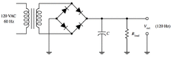 - ^ Quoting US Patent #5402059: A problem can occur when loads on the output of a switching power supply become disconnected from the supply. When this occurs, the output current from the power supply becomes reduced (or eliminated if all loads become disconnected). If the output current becomes small enough, the output voltage of the power supply can reach the peak value of the secondary voltage of the transformer of the power supply. This occurs because with a very small output current, the inductor in the L-C low-pass filter does not drop much voltage (if any at all). The capacitor in the L-C low-pass filter therefore charges up to the peak voltage of the secondary of the transformer. This peak voltage is generally considerably higher than the average voltage of the secondary of the transformer. The higher voltage which occurs across the capacitor, and therefore also at the output of the power supply, can damage components within the power supply. The higher voltage can also damage any remaining electrical loads connected to the power supply. "Archived copy". Archived from the original on 2012-09-07. Retrieved 2008-05-08.