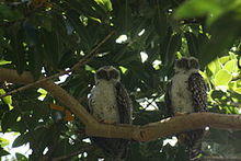 The vast majority of prey is taken from trees, often in or near the tree canopy, including unlikely items such as rock-wallabies (Petrogale spp.) that sometimes take refuge in trees. This species generally glides from perch to perch, watching for prey activity in surrounding trees until potential prey is detected. If the prey becomes aware of the owl too soon, a tail-chase may ensue but many prey species (even diurnal ones such as large passerines) can successfully evade the large predator. Due to the size and power of its talons, death may be instantaneous even for large prey when the owl embeds its talons; however, some prey can still survive even after initial contact if they can escape before the owl makes its "killing grip".[21] Powerful owls frequently take apart prey and consume piecemeal. At daytime perches, it occasionally wakes to consume food until leaving the roost in the evening. The three largest Ninox owls, are the only owls known to exhibit the behaviour of mantling[22] over food while roosting during the day. One theory is that it is the male which regularly holds onto the prey during the day and thus can control distribution of food to the family in keeping with his dominant size, whereas in most owls females are larger and more dominant thus the males could not display such behaviour as keeping food from his larger mate.[16] Caching of part-eaten prey remains has been recorded, although caching of prey is a far more common behaviour in barking owls.[2][3][7] In a study comparing their diets with those of co-existing greater sooty owls (Tyto tenebricosa) and Australian masked owls (Tyto novaehollandiae), these two smaller owls focused on smaller prey on average and ate more small terrestrial mammalian prey rather than the arboreal mammalian prey favoured most exclusively by the powerful owl. However, some overlap in the diet was recorded between all 3 species and a certain level of competition was predicted, in which the powerful owl would presumably be dominant.[14]
