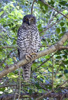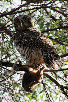 The powerful owl (Ninox strenua), a species of owl native to south-eastern and eastern Australia, is the largest owl on the continent. It is found in coastal areas and in the Great Dividing Range, rarely more than 200 km (120 mi) inland. The International Union for Conservation of Nature (IUCN) Red List of Threatened Species also refers to this species as the powerful boobook.[1] An apex predator in its narrow distribution, the powerful owl is often an opportunist like most predators, but generally is dedicated to hunting arboreal mammals, in particular small to medium-sized marsupials. Such prey can comprise about three-quarters of their diet. Generally, this species lives in primary forests with tall, native trees, but can show some habitat flexibility when not nesting. The powerful owl is a typically territorial raptorial bird that maintains a large home range and has long intervals between egg-laying and hatching of clutches. Also, like many types of raptorial bird, they must survive a long stretch to independence in young owls post-fledging. Unlike most raptorial birds, however, male powerful owls are larger and stronger than females and so the male takes the dominant position in the mating pair, which extends to food distribution.[2][3]