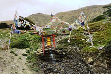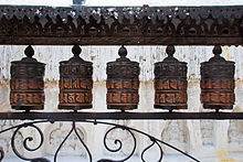 This type of wheel is turned by wind. The wind that touches the prayer wheel helps alleviate the negative karma of those it touches.