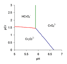 7 are only formed at very low pH so they do not appear on this diagram. Published values for log K1 and log KD are 5.89 and 2.05, respectively.[2] Using these values and the equality conditions, the concentrations of the three species, chromate CrO2−