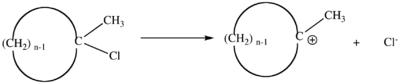 One specific example of a study of rates of reactions for an SN1 reaction is shown on the right. Various sized rings, ranging from four to seventeen members, were used to compare the relative rates and better understand the effect of transannular strain on this reaction. The solvolysis reaction in acetic acid involved the formation of a carbocation as the chloride ion leaves the cyclic molecule. This study fits the general trend seen above that rings with transannular strain show increased reactions rates compared to smaller rings in SN1 reactions.[5]