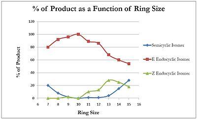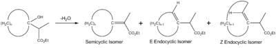The regioselectivity of water elimination is highly influenced by ring size. When water is eliminated from cyclic tertiary alcohols by an E1 route, three major products are formed. The semicyclic isomer (so-called because the double bond is shared by a ring atom and an exocyclic atom) and the (E) endocyclic isomer are expected to predominate; the (Z) endocyclic isomer is not expected to be formed until the ring size is large enough to accommodate the awkward angles of the trans configuration. The exact population of each product relative to the others differs considerably depending upon the size of the ring involved. As the ring size increases, the semicyclic isomer decreases rapidly and the (E) endocyclic isomer increases, but after a certain point, the semicyclic isomer begins to increase again. This can be attributed to transannular strain; this strain is significantly reduced in the (E) endocyclic isomer because it has one less substituent in the ring than the semicyclic isomer.[6]