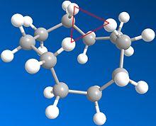 By definition, strain implies discomfiture, so it should follow that molecules with large amounts of transannular strain should have higher energies than those without. Cyclohexane, for the most part, is without strain and is therefore quite stable and low in energy. Rings smaller than cyclohexane, like cyclopropane and cyclobutane, have significant tension caused by small-angle strain, but there is no transannular strain. While there is no small-angle strain present in medium-sized rings, there does exist something called large-angle strain. Some angle and torsional strain is used by rings with more than nine members to relieve some of the distress caused by transannular strain.[1][3]