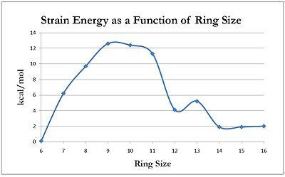 As the plot to the left indicates, the relative energies of cycloalkanes increases as the size of the ring increases, with a peak at cyclononane (with nine members in its ring.) At this point, the flexibility of the rings increases with increasing size; this allows for conformations that can significantly mitigate transannular interactions.[1]