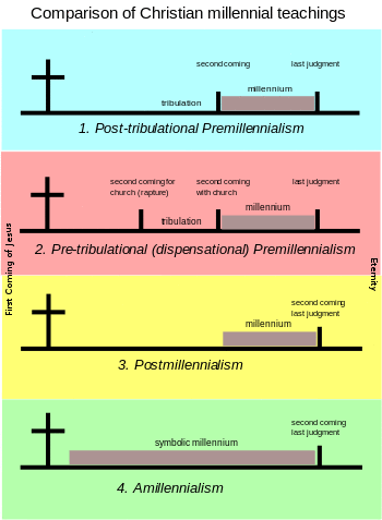 Premillennialism is often used to refer specifically to those who adhere to the beliefs in an earthly millennial reign of Christ as well as a rapture of the faithful coming before (dispensational) or after (historic) the Great Tribulation preceding the Millennium. For the last century, the belief has been common in Evangelicalism according to surveys on this topic.[1] Amillennialists do not view the thousand years mentioned in Revelation as a literal thousand years but see the number "thousand" as symbolic and numerological.