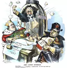 Hanna, on McKinley's behalf, met with the eastern Republican political bosses, such as Senators Thomas Platt of New York and Matthew Quay of Pennsylvania, who were willing to guarantee McKinley's nomination in exchange for promises regarding patronage and offices. McKinley, however, was determined to obtain the nomination without making deals, and Hanna accepted that decision.[88] Many of their early efforts were focused on the South; Hanna obtained a vacation home in southern Georgia where McKinley visited and met with Republican politicians from the region. McKinley needed 453½ delegate votes to gain the nomination; he gained nearly half that number from the South and border states. Platt lamented in his memoirs, "[Hanna] had the South practically solid before some of us awakened."[89]