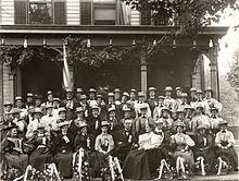 As McKinley's professional career progressed, so too did his social life blossom: he wooed Ida Saxton, the daughter of a prominent Canton family.[45] They were married on January 25, 1871, in the newly built First Presbyterian Church of Canton. Ida soon joined her husband's Methodist church.[46] Their first child, Katherine, was born on Christmas Day 1871.[46] A second daughter, Ida, followed in 1873 but died the same year.[46] McKinley's wife descended into a deep depression at her baby's death and her health, never robust, declined.[46] Two years later, Katherine died of typhoid fever. Ida never recovered from her daughters' deaths, and the McKinleys had no more children.[46] Ida McKinley developed epilepsy around the same time and depended strongly on her husband's presence.[46] He remained a devoted husband and tended to his wife's medical and emotional needs for the rest of his life.[46]