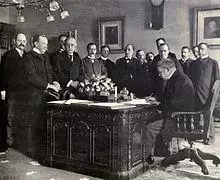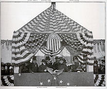 Ohio's governor had relatively little power—for example, he could recommend legislation, but not veto it—but with Ohio a key swing state, its governor was a major figure in national politics.[75] Although McKinley believed that the health of the nation depended on that of business, he was evenhanded in dealing with labor.[76] He procured legislation that set up an arbitration board to settle work disputes and obtained passage of a law that fined employers who fired workers for belonging to a union.[77]