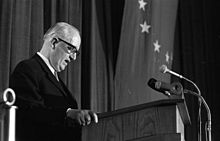In reaction to Hallstein's proposals and actions, then-French president Charles de Gaulle, who was sceptical of the rising supranational power of the Commission, accused Hallstein of acting as if he were a head of state. France eventually withdrew its representative from the Council, triggering the notorious "empty chair crisis".[8] Although this was resolved under the "Luxembourg compromise", Hallstein became the scapegoat for the crisis. The Council refused to renew his term, despite his being the most 'dynamic' leader until Jacques Delors.[9]