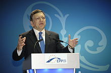 In 2009, the European People's Party (EPP) endorsed Barroso as its candidate for Commission president, and the EPP subsequently retained its position as largest party in that year's election. The Socialists responded by pledging to put forward a rival candidate at future elections.[24] Once again, Barroso was forced by Parliament to make a change to his proposed Commission,[25] but eventually received assent. However, in exchange for approval, Parliament forced some concessions from Barroso in terms of Parliamentary representation at Commission and international meetings.[26] On 7 September 2010, Barroso gave the first US-style State of the Union address to Parliament, which focused primarily on the EU's economic recovery and human rights. The speech was to be annual.[27]