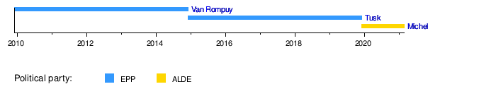 On 19 November 2009, the European Council agreed that its first president under the Lisbon Treaty would be Herman Van Rompuy (European People's Party). Van Rompuy took office when the Lisbon Treaty came into force on 1 December 2009 with a term stretching until 31 May 2012.[3] His term was later extended with a second period ending on 30 November 2014.