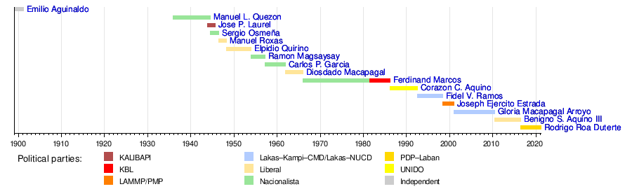 The government considers Aguinaldo to have been the first president of the Philippines, followed by Quezon and his successors.[17][20] Despite the differences in constitutions and government, the line of presidents is considered to be continuous. For instance, the current president, Rodrigo R. Duterte, is considered to be the 16th president.