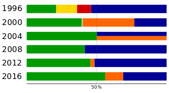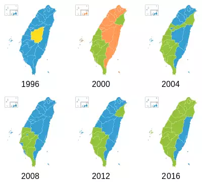 ![]() Comparison of the vote percentages in the direct presidential elections. : Democratic Progressive Party candidates : Kuomintang candidates : People First Party candidates, or James Soong. : New Party nominated or endorsed candidates. : Other independents |