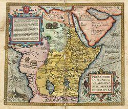- ^ 16th c. map of Africa by Abraham Ortelius (1527–1598), Presbiteri Johannis, sive, Abissinorum Imperii descriptio ("A Description of the Empire of Prester John, that is to say, of the Abysinians"). Copperplate map, with added colour, 35 x 42 cm. From Theatrum Orbis Terrarium... by Ortelius, Antwerp. See File:Prester John map.jpg. Image of 1603 edition see [2] Archived 2008-08-28 at the Wayback Machine. Heraldic tinctures not reliable
