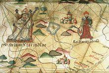 After this point, an African location became increasingly popular. This may have resulted from increasing ties between Europe and Africa as 1428 saw the Kings of Aragon and Ethiopia actively negotiating the possibility of a strategic marriage between the two kingdoms.[43] On 7 May 1487, two Portuguese envoys, Pêro da Covilhã and Afonso de Paiva, were sent traveling secretly overland to gather information on a possible sea route to India, but also to inquire about Prester John. Covilhã managed to reach Ethiopia. Although well received, he was forbidden to depart. More envoys were sent in 1507, after Socotra was taken by the Portuguese. As a result of this mission, and facing Muslim expansion, regent queen Eleni of Ethiopia sent ambassador Mateus to king Manuel I of Portugal and to the pope, in search of a coalition. Mateus reached Portugal via Goa, having returned with a Portuguese embassy, along with priest Francisco Álvares in 1520. Francisco Álvares' book, which included the testimony of Covilhã, the Verdadeira Informação das Terras do Preste João das Indias ("A True Relation of the Lands of Prester John of the Indies") was the first direct account of Ethiopia, greatly increasing European knowledge at the time, as it was presented to the pope, published and quoted by Giovanni Battista Ramusio.[48]