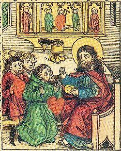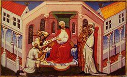 The Prester John legend as such began in the early 12th century with reports of visits of an Archbishop of India to Constantinople, and of a Patriarch of India to Rome at the time of Pope Callixtus II.[12] These visits, apparently from the Saint Thomas Christians of India, cannot be confirmed, evidence of both being secondhand reports. What is certain is that German chronicler Otto of Freising reported in his Chronicon of 1145 that the previous year he had met Hugh, bishop of Jabala in Syria, at the court of Pope Eugene III in Viterbo.[13][14][15] Hugh was an emissary of Prince Raymond of Antioch, sent to seek Western aid against the Saracens after the Siege of Edessa; his counsel inspired Eugene to call for the Second Crusade. Hugh told Otto, in the presence of the pope, that Prester John, a Nestorian Christian who served in the dual position of priest and king, had regained the city of Ecbatana from the brother monarchs of Medes and Persia, the Samiardi, in a great battle "not many years ago". Afterwards Prester John allegedly set out for Jerusalem to rescue the Holy Land, but the swollen waters of the Tigris compelled him to return to his own country. His fabulous wealth was demonstrated by his emerald scepter; his holiness by his descent from the Three Magi.[16]