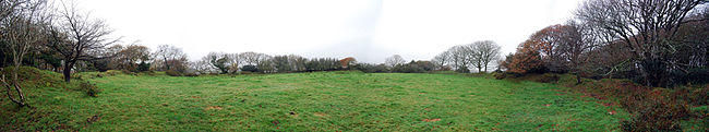 The enclosed area is level and described from the ground as being somewhat elliptical, although from aerial photographs it appears nearly circular.[2] Its diameter is about 100 m, with an area of about 0.8 ha. Its present use is as a cattle pasture, with a frangible, pinkish stone (possibly Devonian sandstone) forming the substrate. Its condition is slowly deteriorating, with less structure now visible than was shown on the 1888 survey map.[3] The northern and eastern ramparts are overgrown with trees, merging into forest. In the vicinity, there is much evidence of mining for iron, tin and kaolinite, with quarries, pits, shafts and dumps in abundance.