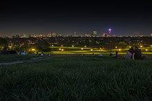 Primrose Hill is a Grade II listed public park located north of Regent's Park in London, England, first opened to the public in 1842.[3][6][7] It was named after the 64 metres (210 ft)[note 1][8][9] natural hill in the centre of the park, the second highest natural point in the London Borough of Camden.[10] The hill summit has a clear view of central London, as well as Hampstead and Belsize Park to the north and is adorned by an engraved quotation from William Blake. Based on the popularity of the park, the surrounding district and electoral ward were named Primrose Hill.[11]