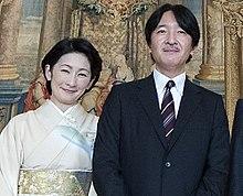 The couple met when they were both undergraduates at Gakushuin University.[8][9] Like his father, the present Emperor Emeritus, the Prince married outside the former aristocracy and former collateral branches of the imperial family. Upon marriage, he received the title Prince Akishino (Akishino-no-miya – strictly "Prince Akishino") and authorization from the Imperial Household Economy Council to form a new branch of the Imperial Family. The marriage was bitterly resented by officials at the Imperial Household Agency, as well as Prince Akishino's paternal-grandmother Empress Dowager Nagako.[9]