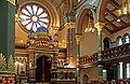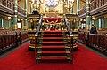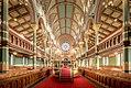 The synagogue has a central nave with aisles on either side, separated by an arcade carried on slender octagonal columns, which also support galleries over the aisles. The nave has a barrel vault lit by clerestory windows. The interior is notable for its lavish decoration, including gilding and unstinting use of the finest woods and marbles.[1] H. A. Meek says, "He who has not seen the interior of Princes Road synagogue in Liverpool has not beheld the glory of Israel."[2]
