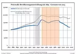 Development of population since 1875 within the current Boundaries (Blue Line: Population; Dotted Line: Comparison to Population development in Brandenburg state; Grey Background: Time of Nazi Germany; Red Background: Time of communist East Germany)