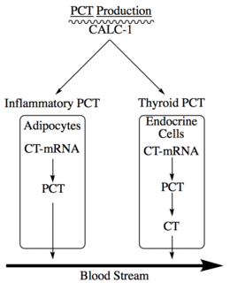 PCT is located on the CALC-1 gene on chromosome 11.[8] Bacterial infections induce a universal increase in the CALC-1 gene expression and a release of PCT (>1 μg/mL).[9] Expression of this hormone occurs in a site specific manner.[8] In healthy and non-infected individuals, transcription of PCT only occurs in neuroendocrine tissue, except for the C cells in the thyroid. The formed PCT then undergoes post-translational modifications, resulting in the production small peptides and mature CT by removal of the C-terminal glycine from the immature CT by peptidylglycine α-amidating monooxygenase (PAM).[11] In a microbial infected individual, non-neuroendocrine tissue also secretes PCT by expression of CALC-1. A microbial infection induces a substantial increase in the expression of CALC-1, leading to the production of PCT in all differentiated cell types.[12] The function of PCT synthesized in nonneuroendocrine tissue due to a microbial infection is currently unknown, but, its detection aids in the differentiation of inflammatory processes.[8]