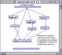Several features of the Prograph system are evident in this picture of a database sorting operation. The upper bar shows that this method, concurrent sort, is being passed in a single parameter, A Database Object. This object is then fed, via the lines, into several operations. Three of these extract a named index (indexA etc.) from the object using the getter operation (the unconnected getter output passes on the "whole" object), and then passes the extracted index to a sort operation. The output of these sort operations are then passed, along with a reference to the original database, to the final operation, update database. The bar at the bottom of the picture represents the outputs of this method, and in this case there are no connections to it and so this method does not return a value. Also note that although this is a method of some class, there is no self; if self is needed, it can be provided as an input or looked up.