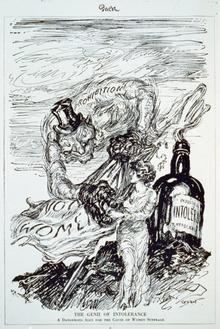 In a backlash to the emerging reality of a changing American demographic, many prohibitionists subscribed to the doctrine of nativism, in which they endorsed the notion that America was made great as a result of its white Anglo-Saxon ancestry. This belief fostered resentments towards urban immigrant communities, who typically argued in favor of abolishing prohibition.[34] Additionally, nativist sentiments were part of a larger process of Americanization taking place during the same time period.[35]