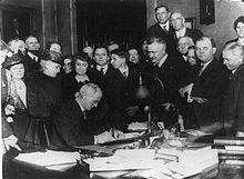 Naval Captain William H. Stayton was a prominent figure in the anti-prohibition fight, founding the Association Against the Prohibition Amendment in 1918. The AAPA was the largest of the nearly forty organizations that fought to end Prohibition.[67] Economic urgency played a large part in accelerating the advocacy for repeal.[68] The number of conservatives who pushed for prohibition in the beginning decreased. Many farmers who fought for prohibition now fought for repeal because of the negative effects it had on the agriculture business.[69] Prior to the 1920 implementation of the Volstead Act, approximately 14% of federal, state, and local tax revenues were derived from alcohol commerce. When the Great Depression hit and tax revenues plunged, the governments needed this revenue stream.[70] Millions could be made by taxing beer. There was controversy on whether the repeal should be a state or nationwide decision.[69] On March 22, 1933, President Franklin Roosevelt signed an amendment to the Volstead Act, known as the Cullen–Harrison Act, allowing the manufacture and sale of 3.2% beer (3.2% alcohol by weight, approximately 4% alcohol by volume) and light wines. The Volstead Act previously defined an intoxicating beverage as one with greater than 0.5% alcohol.[8] Upon signing the Cullen–Harrison Act, Roosevelt made his famous remark: "I think this would be a good time for a beer."[71]