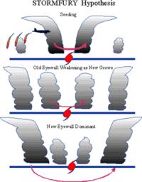 Multiple eyewalls had been detected in very strong hurricanes before, including Typhoon Sarah[25] and Hurricane Donna.[26] Double eyewalls were usually only seen in very intense systems. They had also been observed post-seeding in some of the seeded storms. At the time, the only observations of rapid changes in eyewall diameter, other than during presumably successful seedings, occurred during rapid changes in storm intensity.[27] It remained unclear whether the seedings caused the secondary eyewalls or whether it was just part of a natural cycle[28] (because correlation does not imply causation). It was initially thought that eyewall changes similar to those observed in seeded but not unseeded systems provided the evidence that Project Stormfury was a success. But if it was later observed that such eyewall changes were common in unseeded systems as well, such observations would throw doubt on the hypothesis and assumptions driving Project Stormfury.[29]