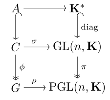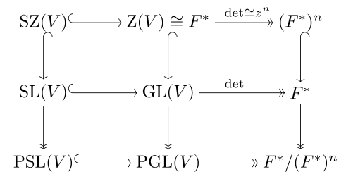 - ^ These are equal because they are the kernel and cokernel of the endomorphism formally, |μn| ⋅ |(F×)n| = |F×|. More abstractly, the first realizes PSL as SL/SZ, while the second realizes PSL as the kernel of PGL → F×/(F×)n.