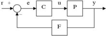 Proportional control dictates . From the block diagram shown, assume that r, the setpoint, is the flowrate into a tank and e is error, which is the difference between setpoint and measured process output. is process transfer function; the input into the block is flow rate and output is tank level.