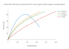 In aircraft and rocket design, overall propulsion system efficiency is the efficiency with which the energy contained in a vehicle's fuel is converted into kinetic energy of the vehicle, to accelerate it, or to replace losses due to aerodynamic drag or gravity. Mathematically, it is represented as ,[1] where is the cycle efficiency and is the propulsive efficiency.